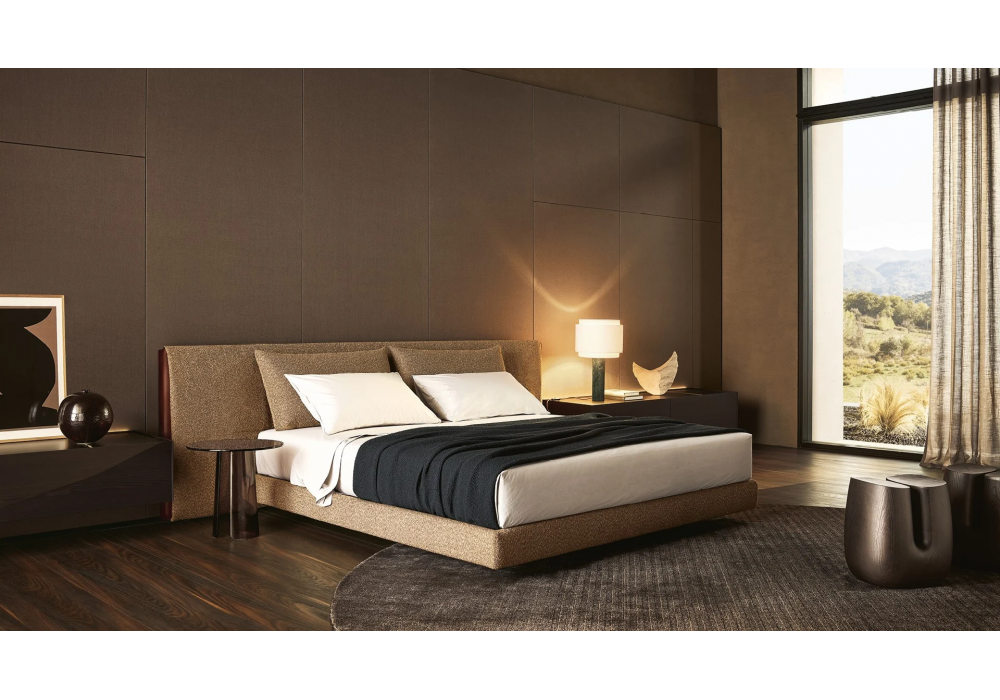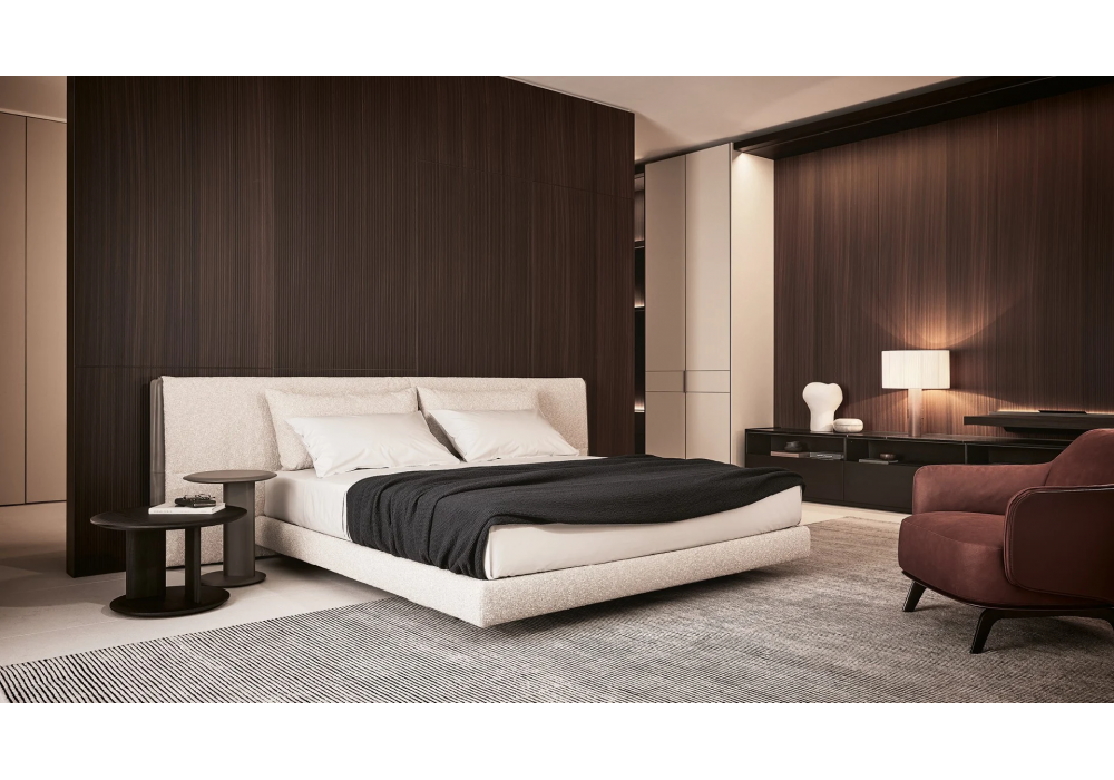 Yume, von Jean Marie Massaud für Poliform entworfen, ist ein Bett mit gepolstertem Holzgestell und Bezug aus Stoff oder Leder. Gepolstertes Kopfteil mit Bezug aus Stoff oder Leder und seitlichen Einsätzen aus Kernleder.