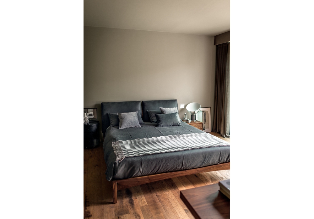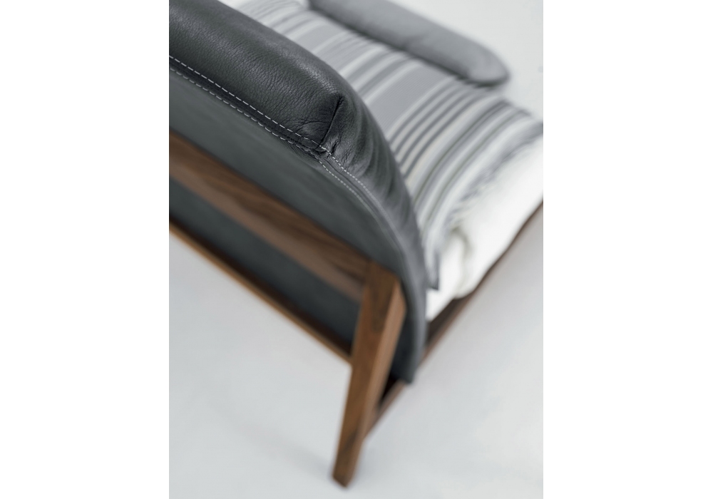 Sleepy von Vegni Design für Riva 1920 entworfen, ist ein Bett mit einer Struktur aus Massivholz kombiniert mit einem geschwungenen, gepolsterten Kopfteil, das mit Leder oder Stoff bezogen ist.