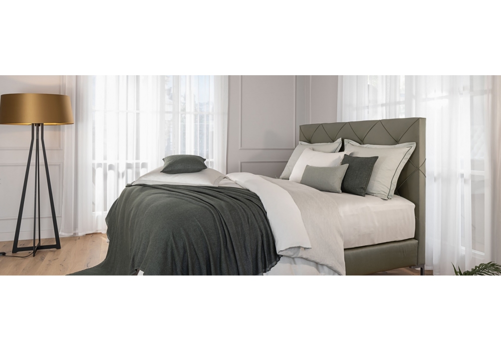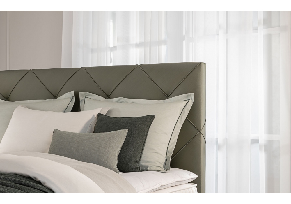 Chloé von Annette Lang für Treca Interiors Paris entworfen, ist ein Kopfteil mit Holzstruktur und nicht abnehmbarem Stoffbezug aus Stoffquadraten, die zusammengenäht und mit Passepoil (Kordel) aus demselben Stoff veredelt sind. Verfügbar in mehreren Abmessungen und Ausführungen.