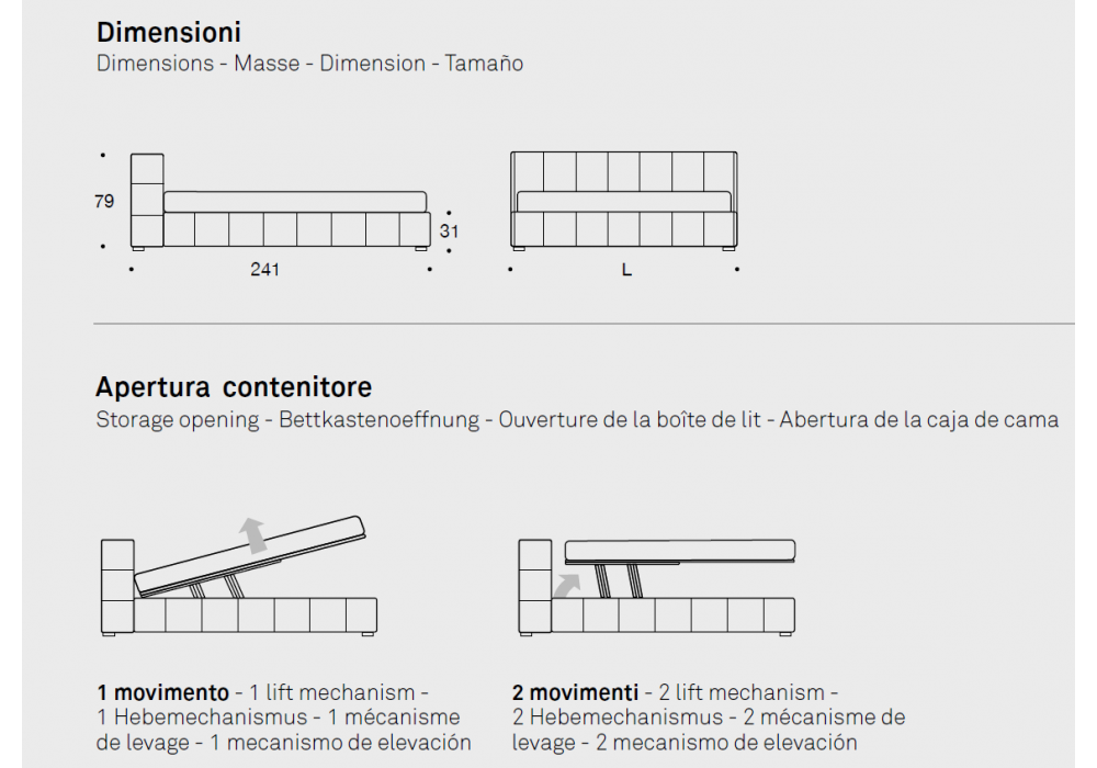 | Abmessungen | - 227 x 241 x H 79 cm; - 207 x 241 x H 79 cm; - 187 x 241 x H 79 cm; - 147 x 241 x H 79 cm. |