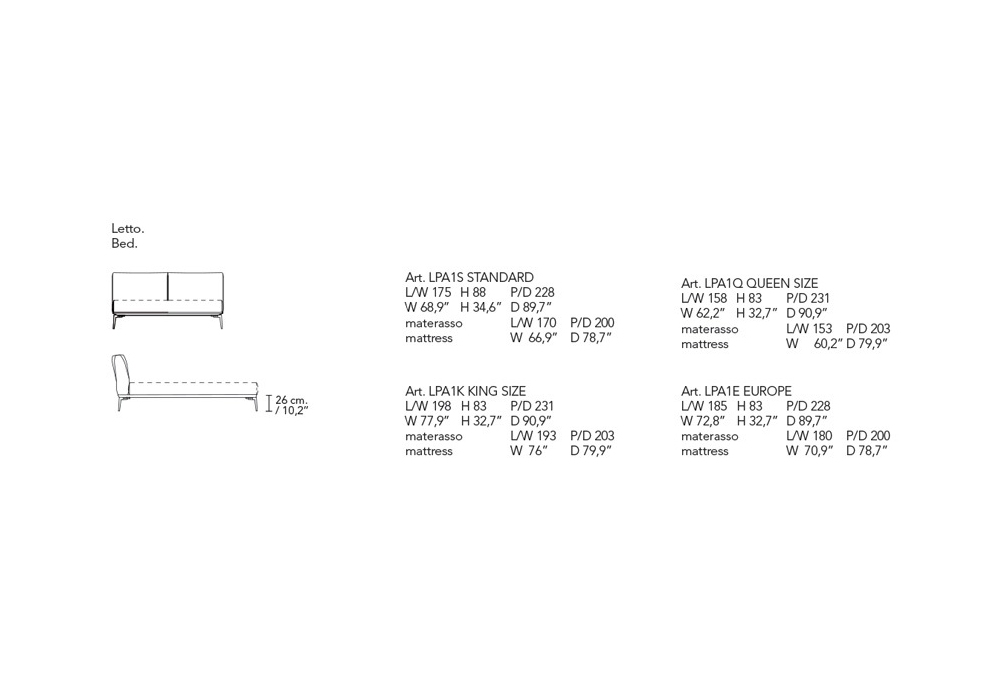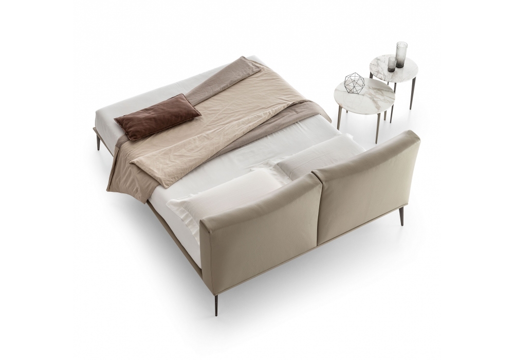 Papillon von Giuseppe Bavuso für Alivar entworfen, ist ein Bett mit einem Kopfteil aus Stahl und Holz mit Polsterung aus Polyurethanschaum unterschiedlicher Dichte und Futter aus Polyesterfaser. Bettrahmen aus Stahl und Holz mit Polyurethanschaum und Polyesterfaserfutter. Füße aus poliertem oder lackiertem Aluminiumguss und Bezug aus Leder oder Stoff. Auf Wunsch Lattenroste mit Buchenholzleisten.