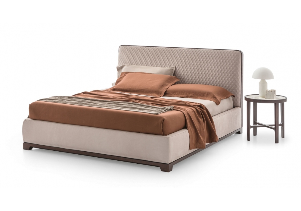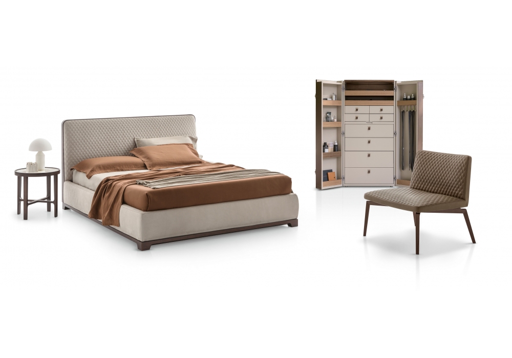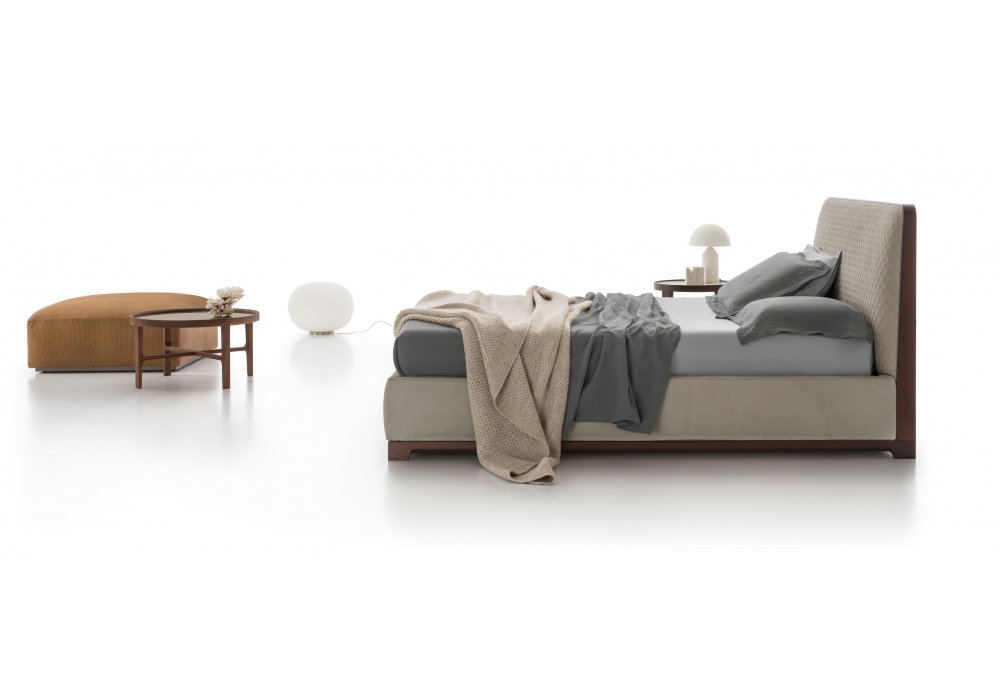 Bali von Giuseppe Bavuso für Alivar entworfen, ist ein Bett mit Gestell aus massiver lackierter Esche oder nationalem Nussbaum und Kopfteil aus Holz, das mit Polyurethanschaum unterschiedlicher Dichte mit Polyesterfaserfutter gepolstert ist, mit Holz- oder Polsterstruktur. Bettrahmen aus Tannensperrholz mit Polyurethanschaum und gekoppelter Zwischenlage. Polsterung des vorderen Kopfteils aus gestepptem Leder mit exklusivem Alivar-Design. Basis aus Birkensperrholz mit gebogenen Latten mit Steifheitseinstellern im Lendenbereich. Auch in der Version mit Behälter mit anhebbarem Boden erhältlich.