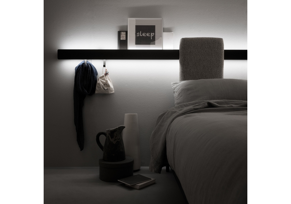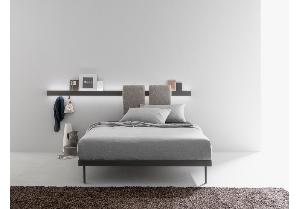 Groove, von Monica Graffeo für Caccaro entworfen, ist ein Bett mit unabhängigem Kopfteil und Bettrahmen, das Kopfteil hat verschiebbare, gepolsterte und abnehmbare Kissen. Erhältlich in verschiedenen Größen und Ausführungen. Matratze nicht enthalten.
