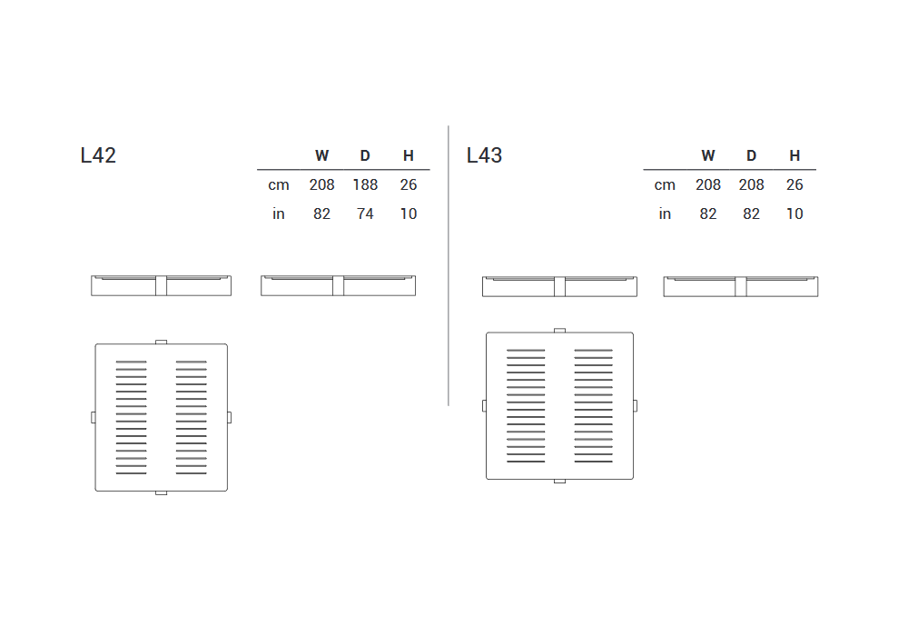 | Abmessungen | - 208 x 188 x H 26 cm; - 208 x 208 x H 26 cm. |