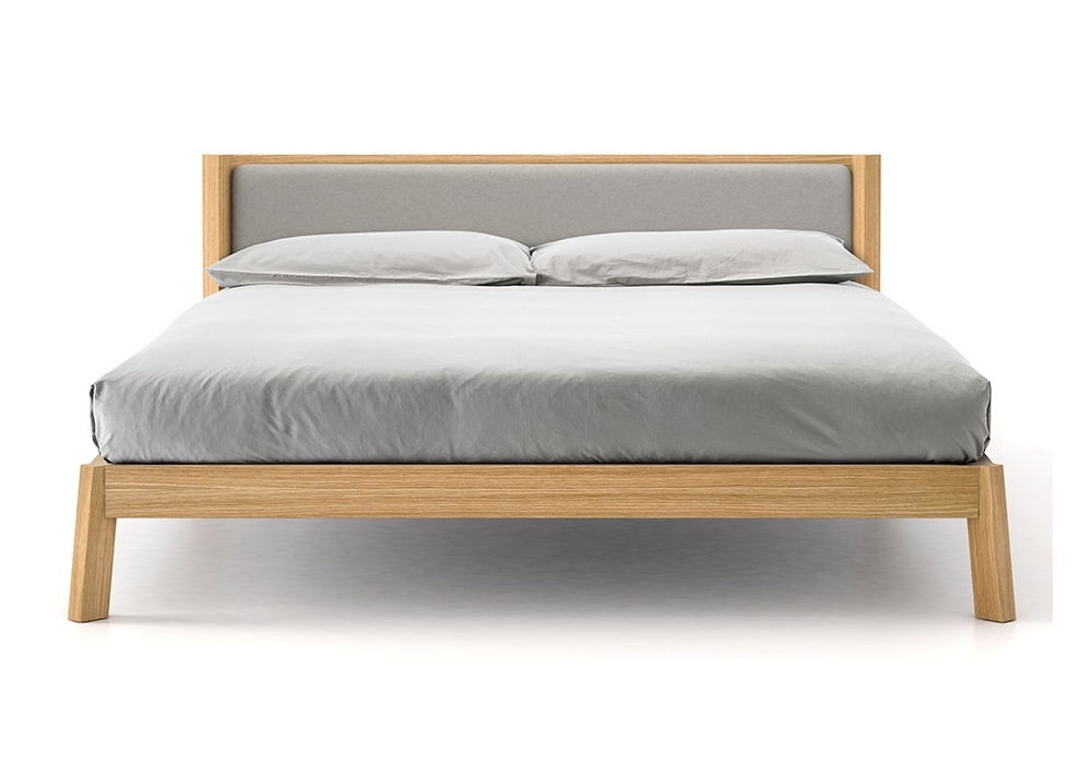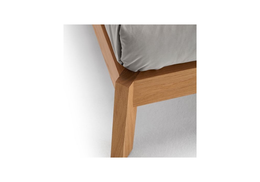 Breda von Borja Garcia für Punt entworfen, ist ein Bett mit Gestell aus massivem Eichenholz mit Kopfteil aus MDF mit Eichenfurnier und Bezug aus Stoff oder Leder. Auch mit Kopfteil passend zur Struktur verfügbar.