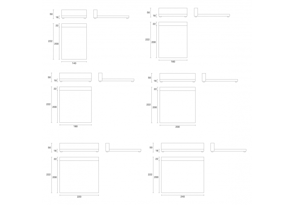| Abmessungen | 140 x 222 x H 50 cm; 160 x 222 x H 50 cm; 180 x 222 x H 50 cm; 200 x 222 x H 50 cm; 200 x 222 x H 50 cm; 220 x 222 x H 50 cm; 240 x 222 x H 50 cm. |