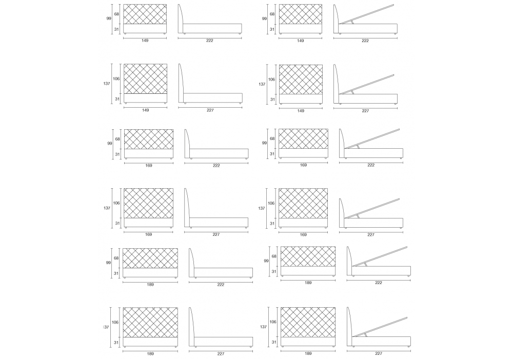 | Abmessungen | 149 x 222 x H 99 cm; 149 x 227 x H 137 cm; 169 x 222 x H 99 cm; 169 x 227 x H 137 cm; 189 x 222 x H 99 cm; 189 x 227 x H 137 cm. |