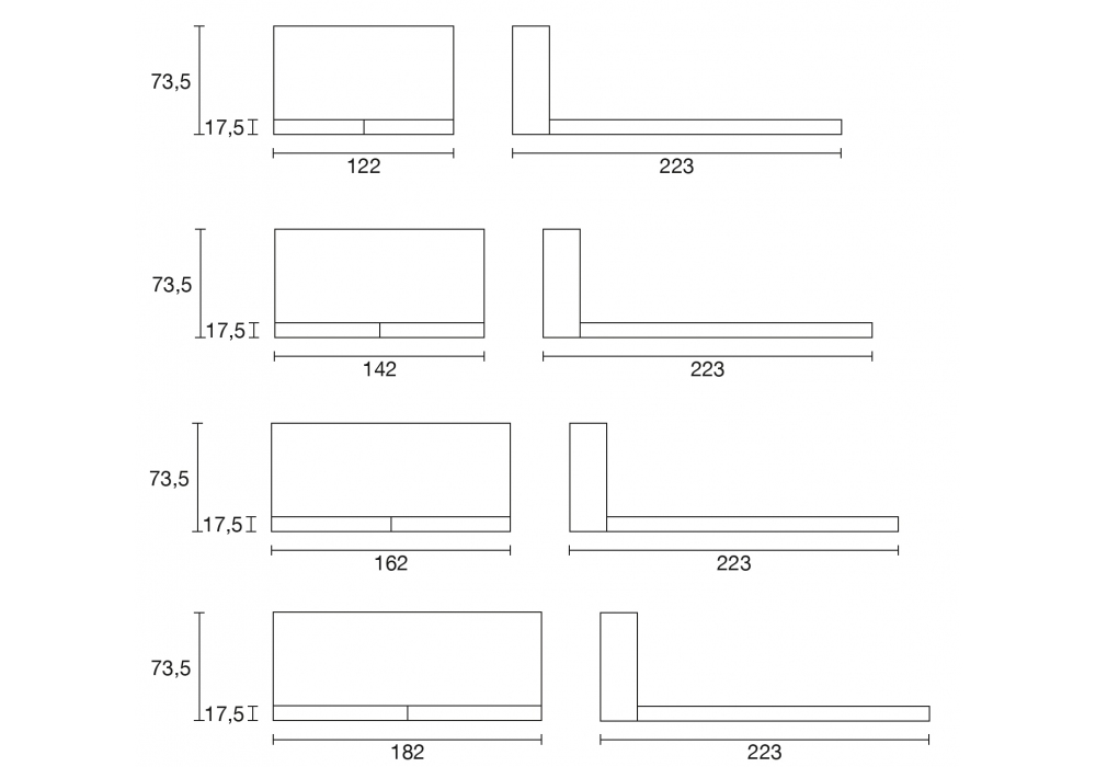 | Abmessungen | 122 x 223 x H 73.5 cm; 142 x 223 x H 73.5 cm; 162 x 223 x H 73.5 cm; 182 x 223 x H 73.5 cm. |