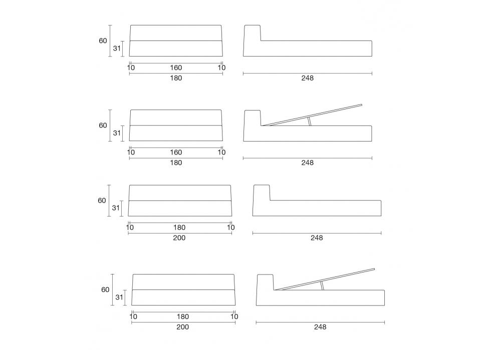 | Abmessungen | 180 x 248 x H 60 cm; 200 x 248 x H 60 cm. |