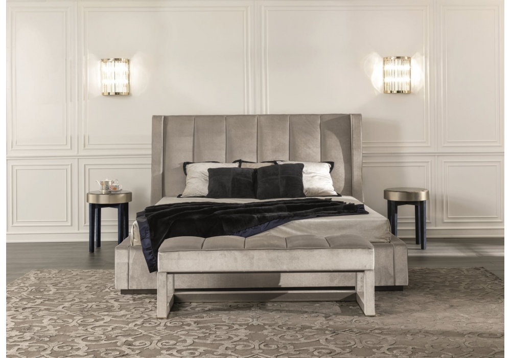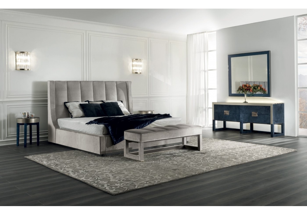 Kubrick von Giuseppe Viganò für Longhi entworfen, ist ein Bett mit Holzstruktur, die mit Polyurethanschaum mit doppelter Dichte überzogen ist, starr auf der Struktur, mittel auf dem Kopfteil. Die vom Kopfteil getrennte Bettrahmenbasis wird mit Metallwinkeln montiert, die eine einfache Montage ermöglichen und die Positionierung und Höhe der Bettbasis ermöglichen, indem sie von der Bettkante abgesenkt werden. Sockel aus pulverbeschichtetem Metall in Schwarz oder Bronze und Struktur mit nicht abnehmbarem Leder- oder Stoffbezug. Auf Anfrage ist es möglich, ein Paar elektrifizierter Netze einzufügen.