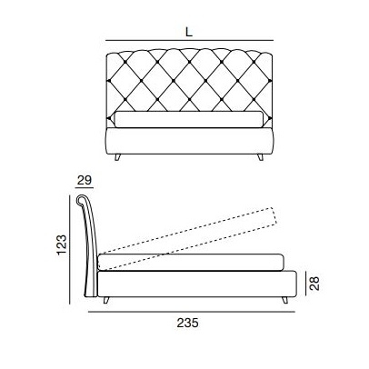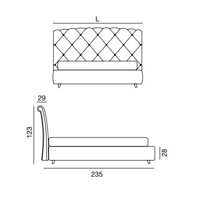 Dorian, entworfen und hergestellt von Twils, ist ein Polsterbett mit einem 28 cm hohen Bettrahmen, das in verschiedenen Größen hergestellt wird. Der nicht abnehmbare Bezug ist in verschiedenen Stoffen und Farben erhältlich. Die Füße (PIE48) sind zwiebelförmig abgerundet und in Nussbaum Canaletto ausgeführt (auf Anfrage auch in anderen Formen und Ausführungen erhältlich).