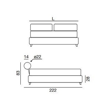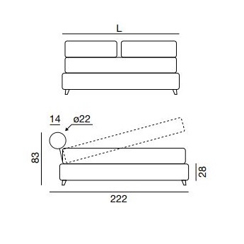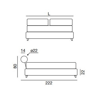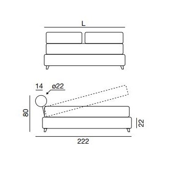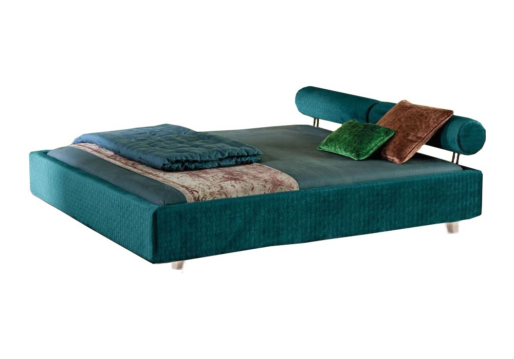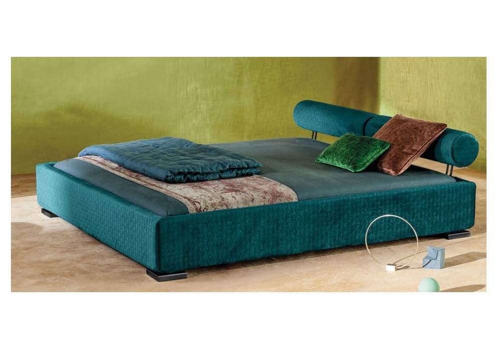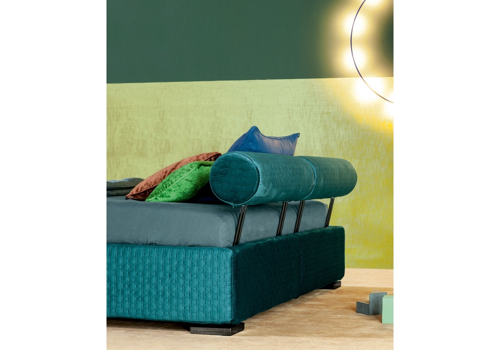 Max Rollò, entworfen und hergestellt von Twils, ist ein Polsterbett mit einem 22 oder 28 cm hohen Bettrahmen. Das Kopfteil besteht aus zwei gepolsterten Zylindern, die von soliden Metallstützen getragen werden. Der abnehmbare Bezug (nicht bei der Lederversion) ist in verschiedenen Stoffen und Farben erhältlich. Das Bett ist in verschiedenen Ausführungen und Größen erhältlich. Die Füße sind aus schrägem Holz mit Perlmutt-Finish.