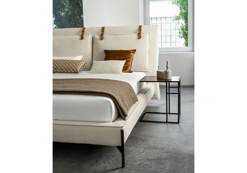 SP2802 Belt von Silvia Prevedello für Twils entworfen, ist ein gepolstertes Bett mit 18 oder 28 cm hohem Bettrahmen, mit niedrigem Kopfteil mit Stützkissen, die von vier Ledergurten getragen werden. Der abnehmbare Bezug ist in verschiedenen Stoffen und Farben erhältlich. Das Bett ist in verschiedenen Ausführungen und Größen erhältlich. Die Füße haben ein Graphit-Finish oder perlmuttfarbenes Holz.