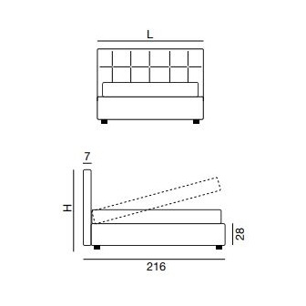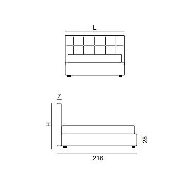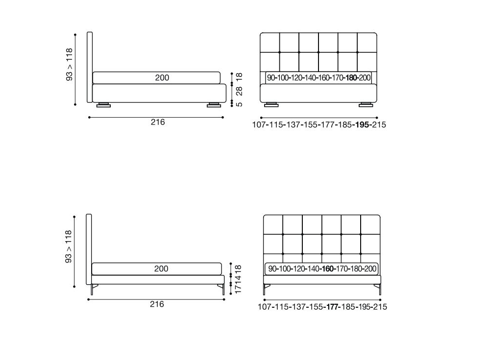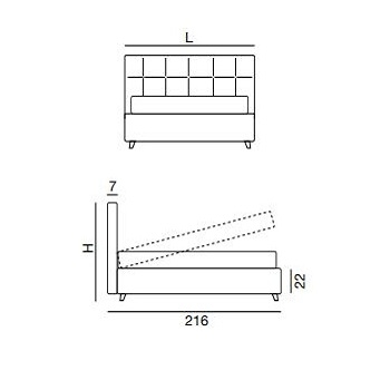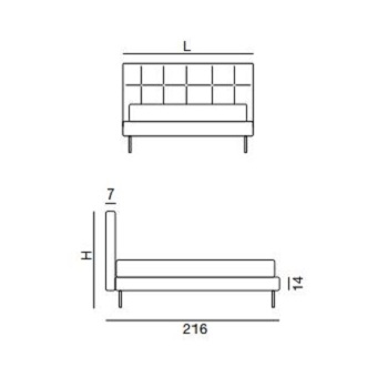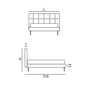 Max Basso Capitonné, entworfen und hergestellt von Twils, ist ein Polsterbett mit einem 14, 22 oder 28 cm hohen Bettrahmen und niedrigem Kopfteil. Der nicht abnehmbare Bezug ist in verschiedenen Stoffen und Farben erhältlich. Das Bett ist mit oder ohne Staukasten erhältlich. Die Füße sind aus poliertem Aluminium oder geneigtem Holz mit Perlmutt-Finish.