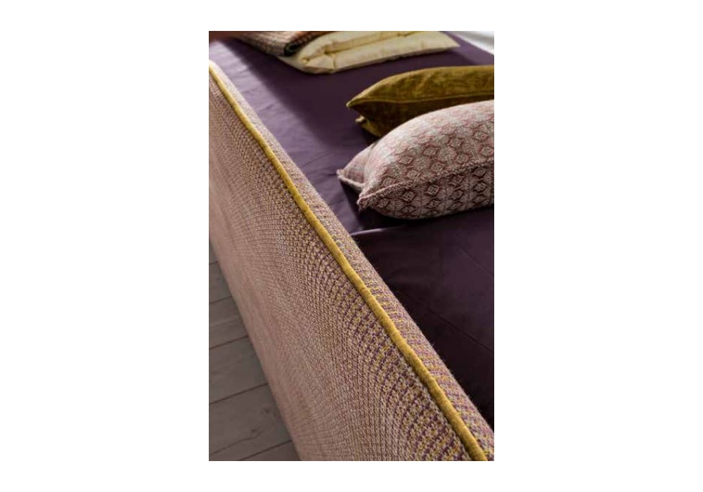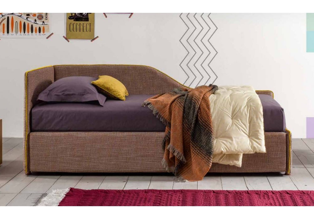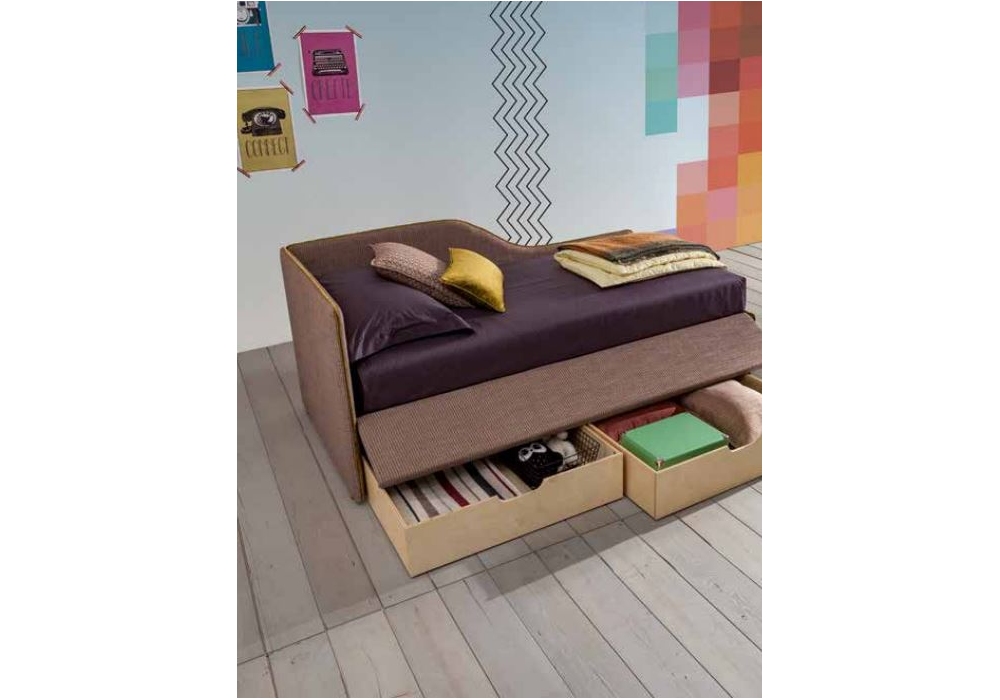 Maya Mod. 8, entworfen und hergestellt von Twils, ist ein ausziehbares Einzelbett mit Seitenkasten. Der abnehmbare Bezug ist in verschiedenen Stoffen und Farben erhältlich. Auf Wunsch zweifarbig mit Wave-Dekor.