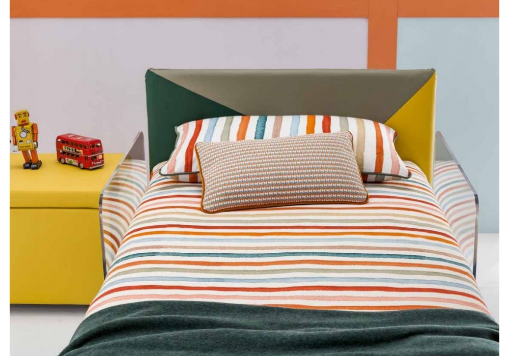 Maya Mod. 2, entworfen und hergestellt von Twils, ist ein ausziehbares Einzelbett mit Seitenkasten. Der abnehmbare Bezug ist in verschiedenen Stoffen und Farben erhältlich. Auf Wunsch zweifarbig mit Triangle-Dekor.