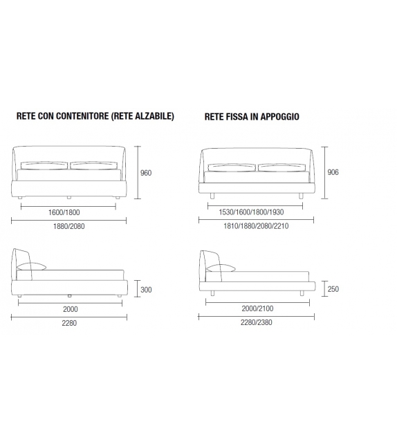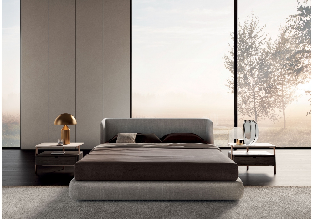 Virgin von Mauro Lipparini für MisuraEmme entworfen, ist ein Bett, das mit oder ohne Kasten und in verschiedenen Abmessungen erhältlich ist. Es zeichnet sich durch sein umhüllendes Kopfteil aus, das mit Stoff oder Leder bezogen ist.