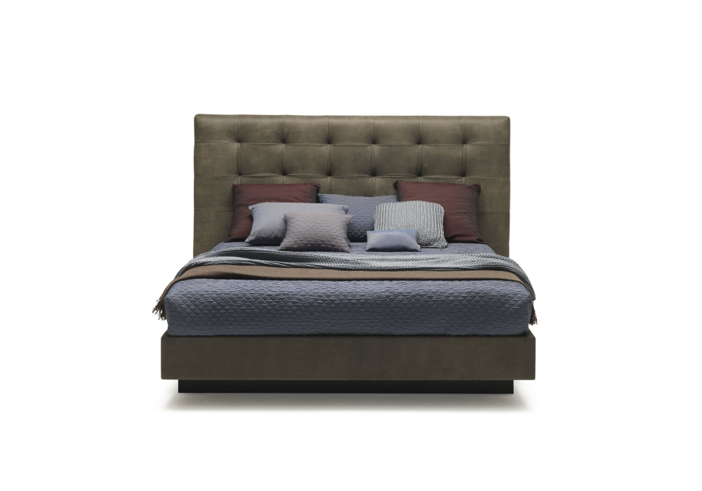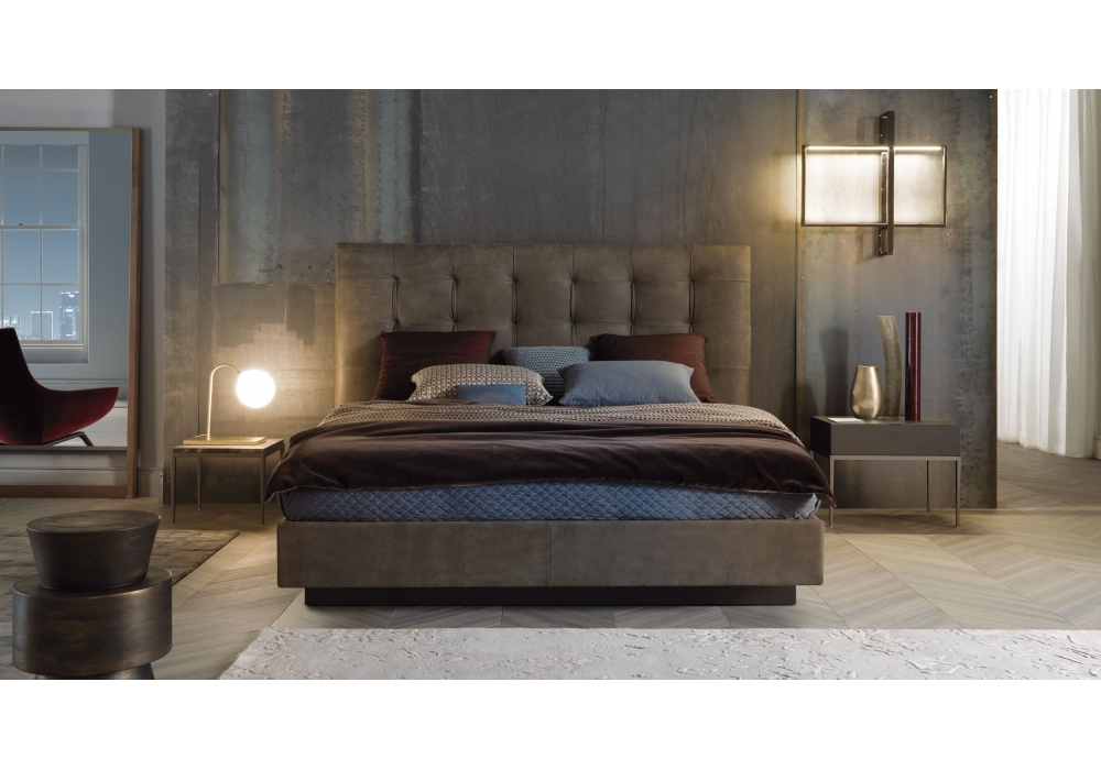 Frida von Ennio Arosio für MisuraEmme entworfen, ist ein Bett mit gepolstertem Bettrahmen und Kopfteil mit Stoff-, Leder- oder Kunstlederbezug. Das Kopfteil zeichnet sich durch ein Capitonné-Finish aus. Basisoption, mit Container mit zweifach anhebbarem Bettboden oder mit festem Standard-Flachbettboden als Stütze. Kopfteil bestehend aus einer mit Polyurethanschaum überzogenen Platte, doppelter Bezug mit Jersey und weißer Baumwolle.