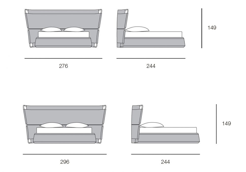| Abmessungen | 276 x 244 x H 149 cm (180 x 200 cm); 296 x 244 x H 149 cm (200 x 200 cm). |