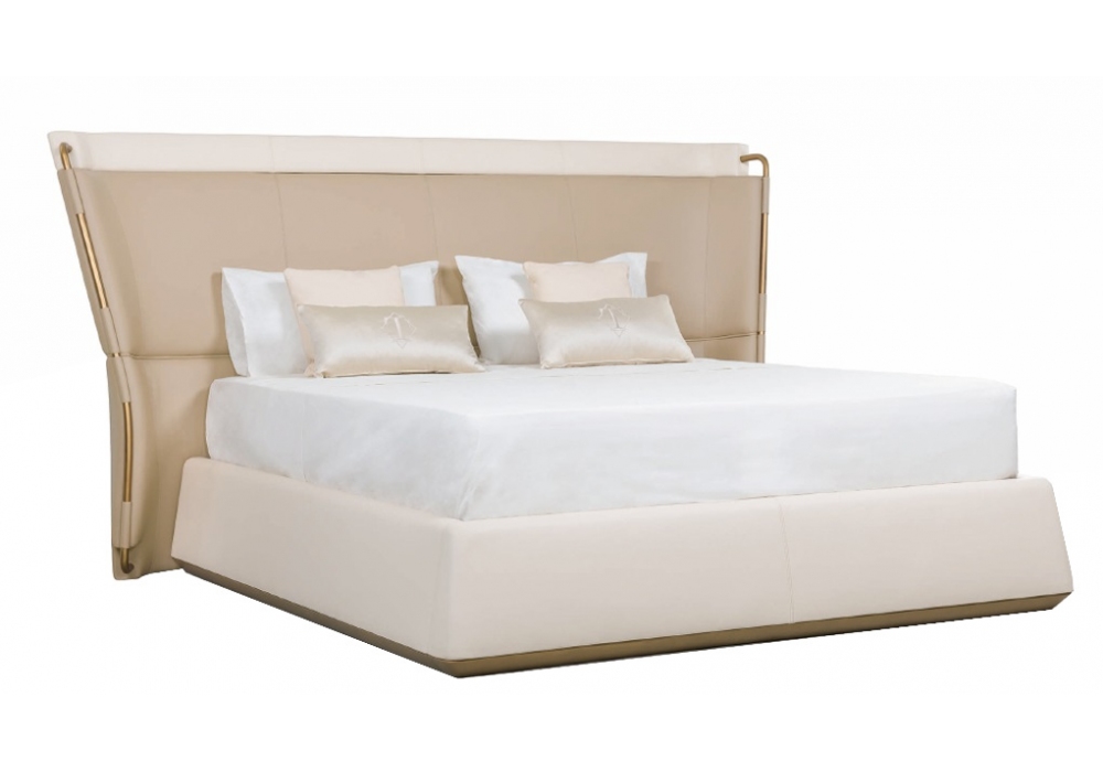Melting Light von Frank Jiang für Turri entworfen, ist ein Bett mit Sperrholz- und Massivholzstruktur, Polsterung aus Polyurethanschaum mit mehreren Dichten und Struktur und Kopfteilbezug aus verschiedenen Ledern oder Stoffen. Metallteile in Gold oder gebürsteter Bronze.