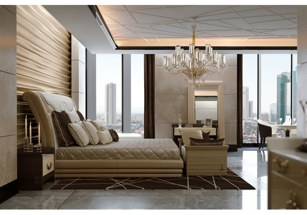 Numero Tre von Roberto Serio für Turri entworfen, ist ein Bett mit Struktur aus Sperrholz und Spanplatten und Massivholzplatte mit Stoff- oder Lederbezug. Der Bettrahmen ist in der glatten Ausführung oder mit drei Bändern verfügbar. Als Zubehör ist es möglich, einen Umhang aus glattem oder besticktem Stoff hinzuzufügen.