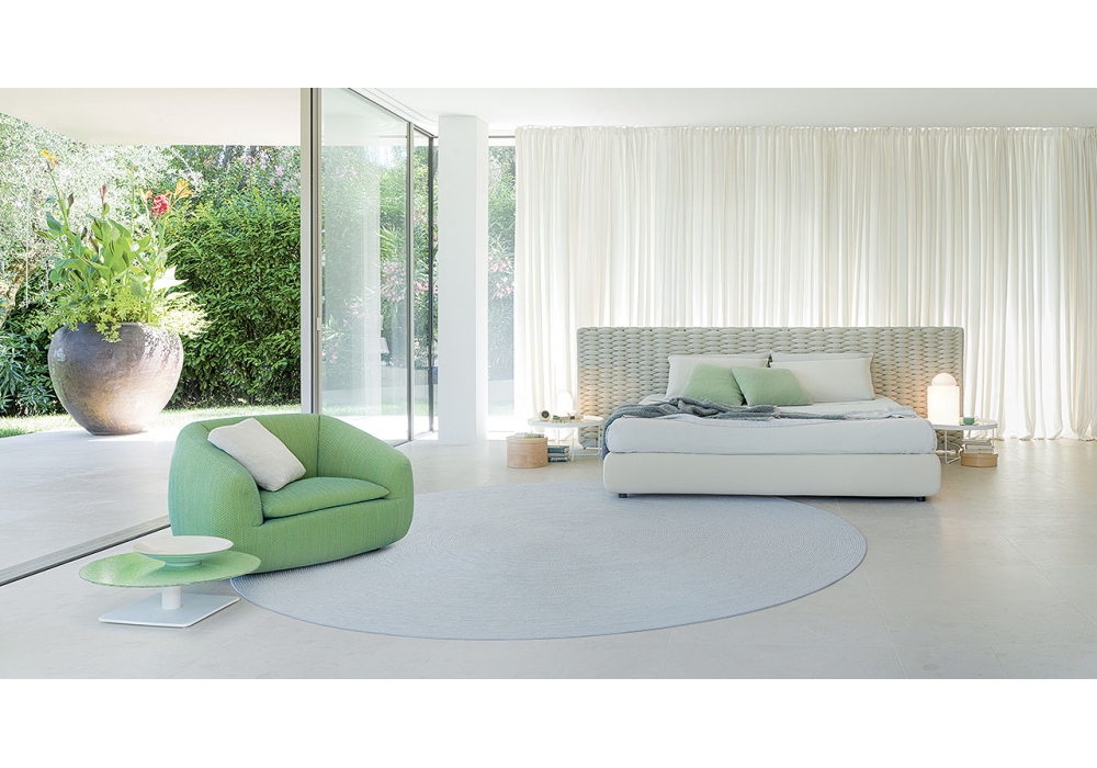 Silent Line, von Francesco Rota für Paola Lenti entworfen, ist ein Bett mit abnehmbarem Bezug und Kopfteil, das mit Polyester-gepolstertem Ketten-Schlauchstrick bezogen ist. Erhältlich in verschiedenen Größen. Inklusive Lattenrost.