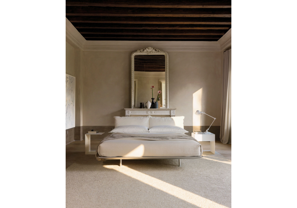 Platz von R&S désirée für Désirée entworfen, ist ein Bett mit einer Struktur aus Aluminium, Sperrholz und Metall. Polsterung des Kopfteils aus ökologischem Polyurethan mit unterschiedlicher Dichte und Federn, bezogen mit Baumwollleinen. Die Polsterung besteht aus vollständig abnehmbarem Stoff oder Leder. Füße aus poliertem Aluminium.