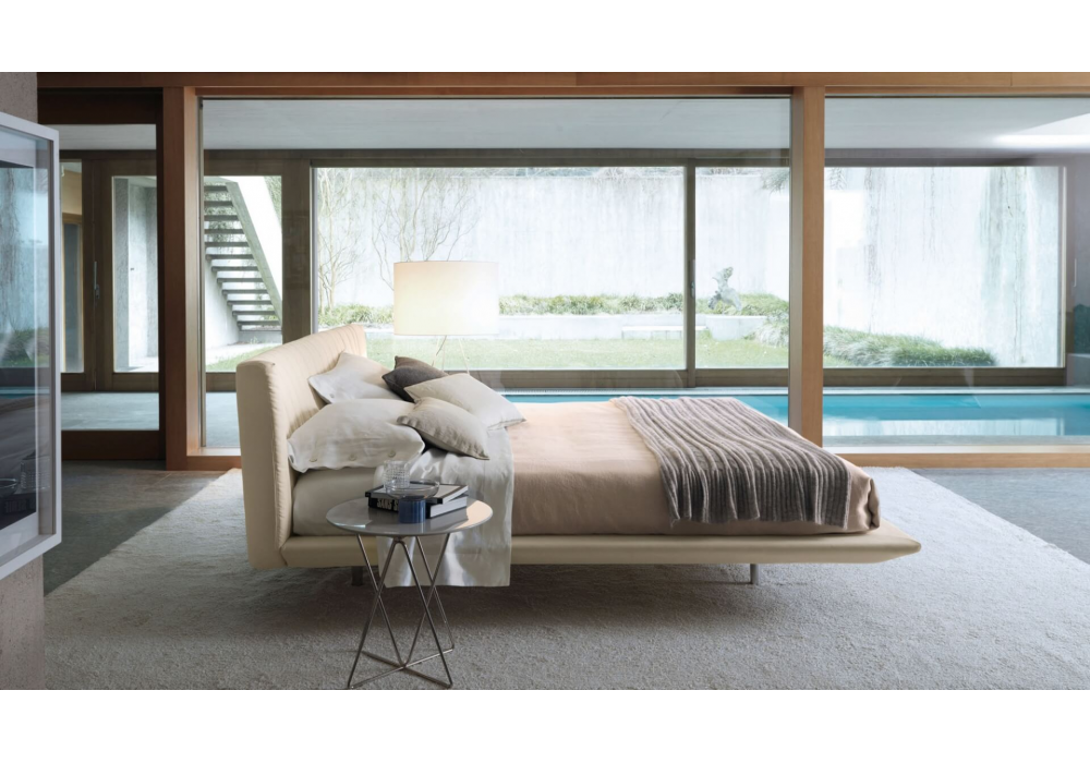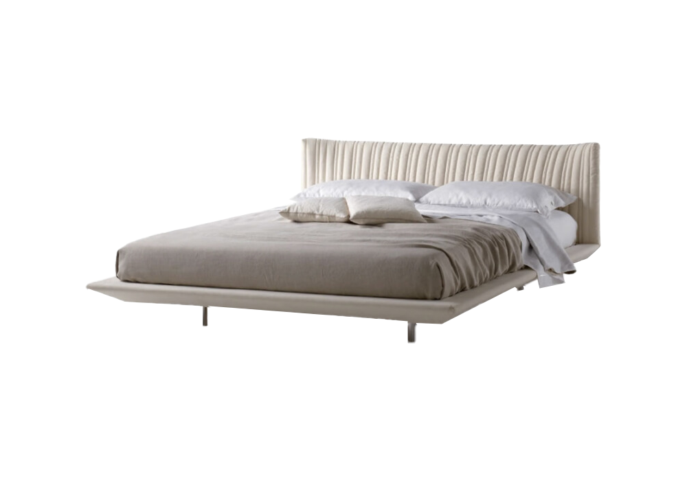 Shellon von Setsu & Shinobu Ito für Désirée entworfen, ist ein Bett mit Metall- und Sperrholzstruktur, gepolstert mit Polyurethan und bedeckt mit einem schützenden Stoffbezug. Die Füße bestehen aus poliertem Aluminium oder auf Wunsch in mattem Bronze-Finish. Komplett abnehmbarer Bezug aus Stoff oder Leder. Das Futter des Kopfteils ist innen vertikal gesteppt.