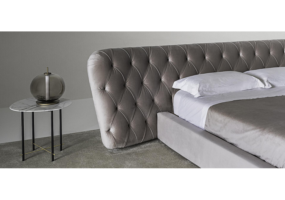 Royale Capitonné, entworfen von Castello Lagravinese Studio für Casamilano, ist ein Bett mit Capitonné-Kopfteil aus massiver Tanne, Kiefernsperrholz und MDF. Sockel aus Spanplatten mit ABS-Füßen. Polsterung aus Polyurethanschaum und fester Bezug aus verschiedenen Stoffen oder Ledern.