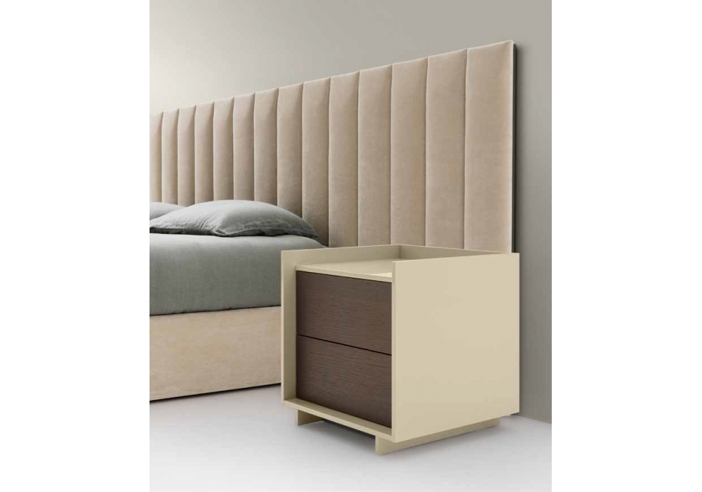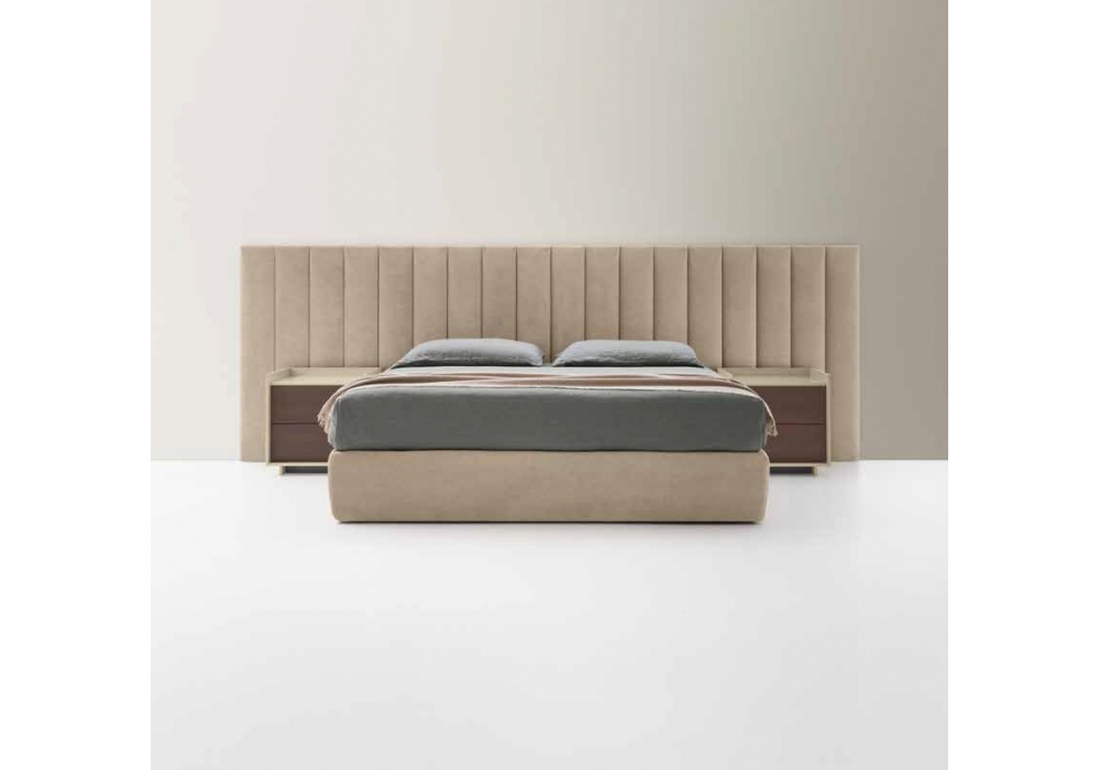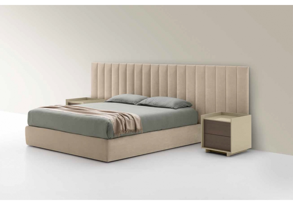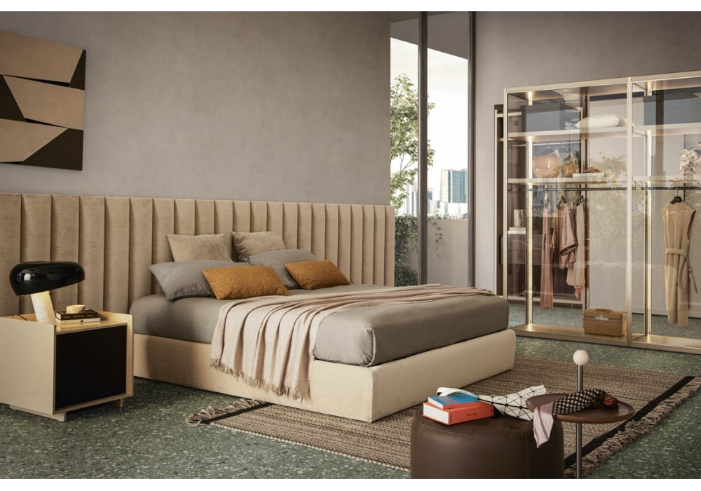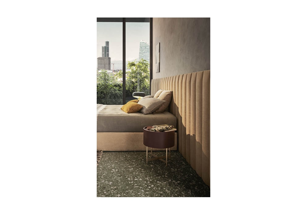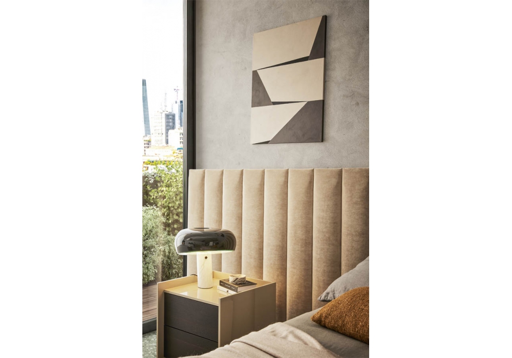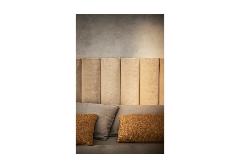Boiserie Soft von Pianca entworfen, ist eine Boiserie, die aus gepolsterten modularen Bändern besteht, die sich im letzten Teil verjüngen, um einen Hauch von Dynamik und Stil zu verleihen. Die Möglichkeit, eine Randbeleuchtung einzubauen, verstärkt den szenischen Effekt, verschönert das Ganze und lässt das Bett zum absoluten Protagonisten werden: einzigartig, raffiniert, königlich. Optional ist die Kombination mit glattem Holz oder lackierter Boiserie möglich, für mehr kompositorische und materielle Dynamik.
