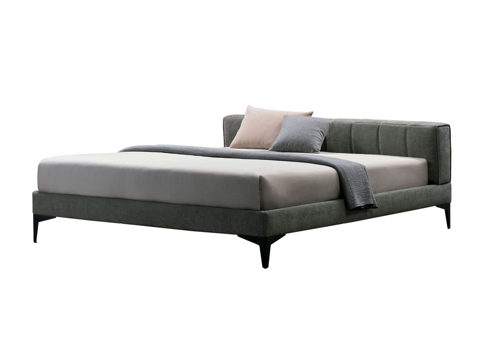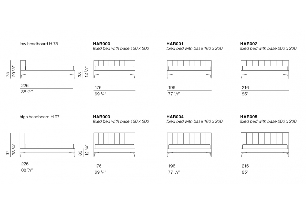 Harry von Studio RES für Bodema entworfen, ist ein Bett mit einer Holzstruktur, die mit expandiertem Polyurethan überzogen ist. Metallbasis und Buchenlatten mit Steifigkeitsverstellern. Polsterung aus Polyurethan mit Futter aus Nylonfaser-Samt. Metallfüße mit Mangan-Finish. Komplett abnehmbarer Stoffbezug. Lederpolsterung mit möglichen Nähten am Bettrahmen. Erhältlich mit zwei Kopfteilhöhen, 75 oder 97 cm.
