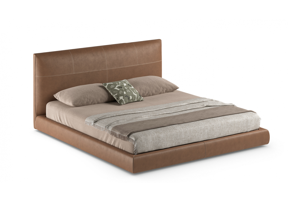 Oris von Gabriele und Oscar Buratti für Bonaldo entworfen, ist ein Bett mit schwarzen Metallbeinen und Stoff- oder Lederpolsterung.