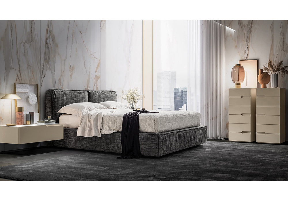 Amore von Kico entworfen, ist ein Bett mit Kopfteil und Bettrahmen, die mit Stoff oder Leder bezogen sind. Die kastenförmige Struktur ist in drei Ausführungen erhältlich und kann mit sechs verschiedenen Fußtypen konfiguriert werden.