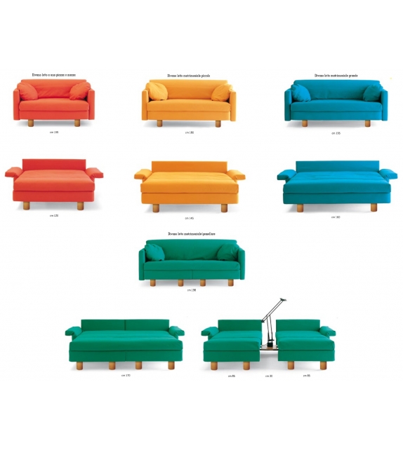 Dandy von Campeggi entworfen, ist ein Schlafsofa mit praktischen verstellbaren Armlehnen und abnehmbarem Bezug. Lattenrost aus laminiertem Buchenholz mit hochverdichteter Polyurethanmatratze.