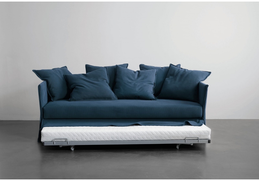 Fox, von Andrea Parisio für Meridiani entworfen, ist ein twin bed mit integriertem Lattenrost und gepolsterten, abziehbaren Holzpaneelen. Sitz-Liege-Matratze, abziehbar, Rückseite Drell, Polsterung aus PU-Schäumen und antiallergischer Polyesterfaserabdeckung.