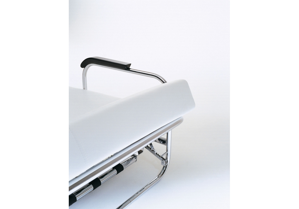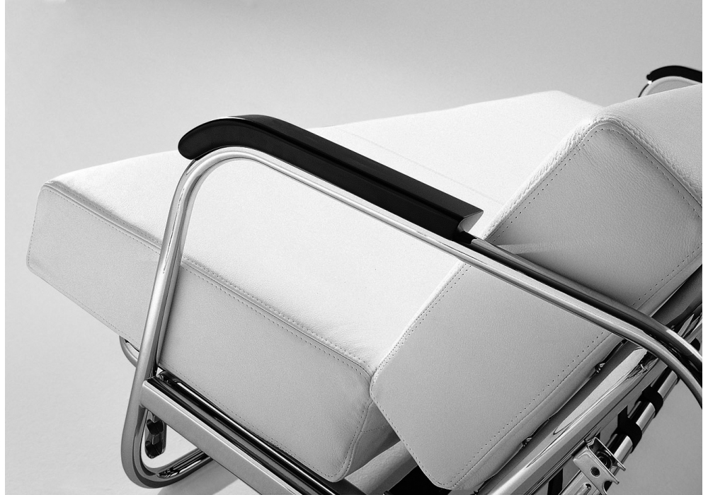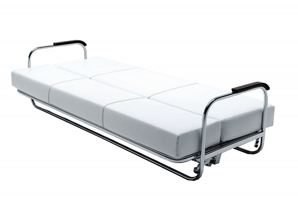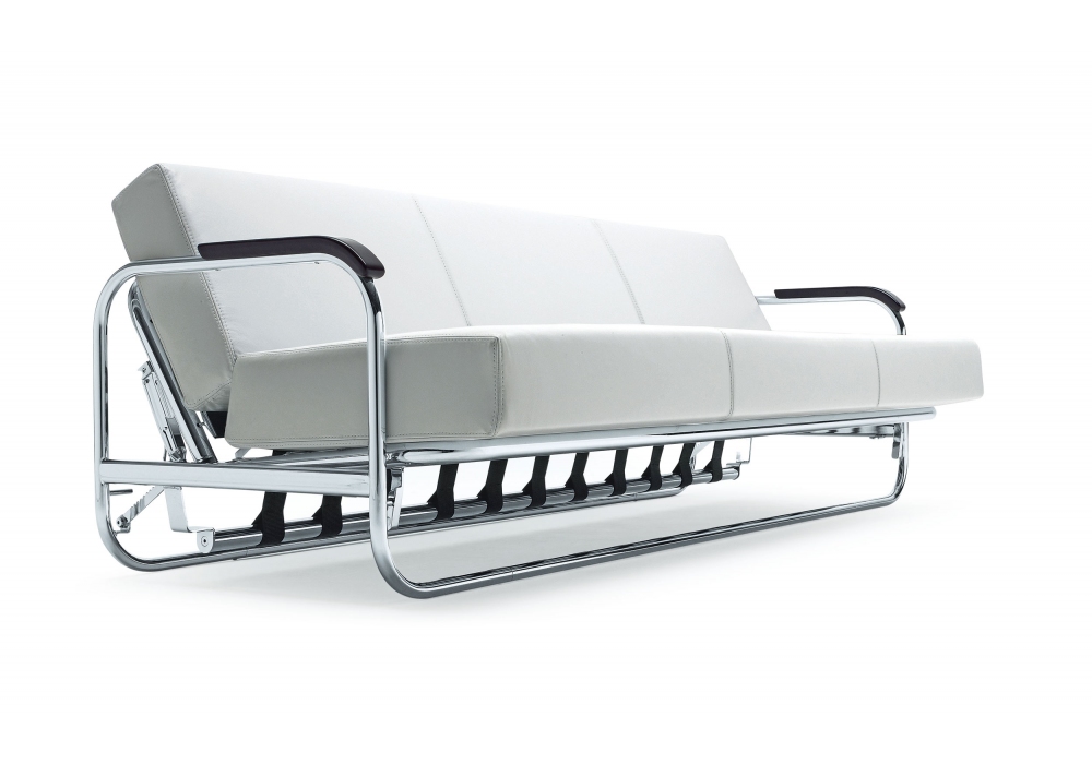 AA1 von Alvar Aalto für MisuraEmme entworfen, ist ein Schlafsofa mit verchromter Rohrstruktur, Armlehnen aus schwarz lackiertem Massivholz und abnehmbarer Bezug aus Stoff oder Leder. Rückenlehnenkissen mit verstellbarer Neigung.
