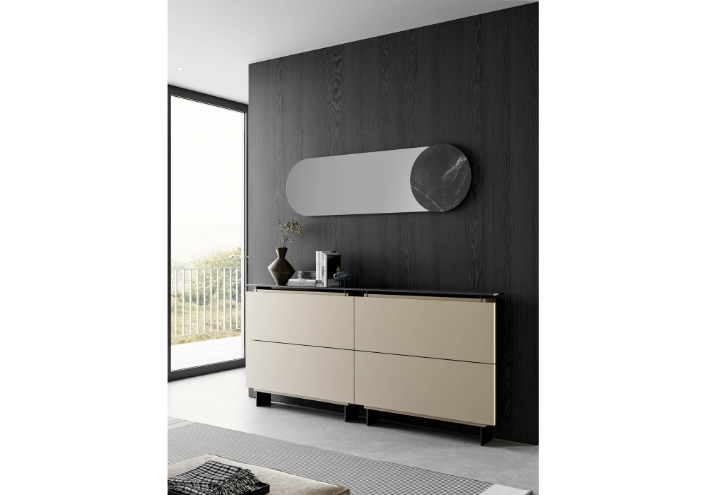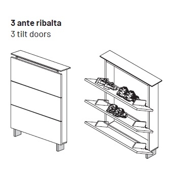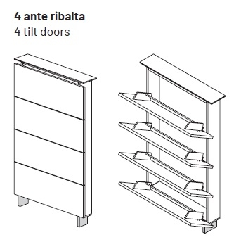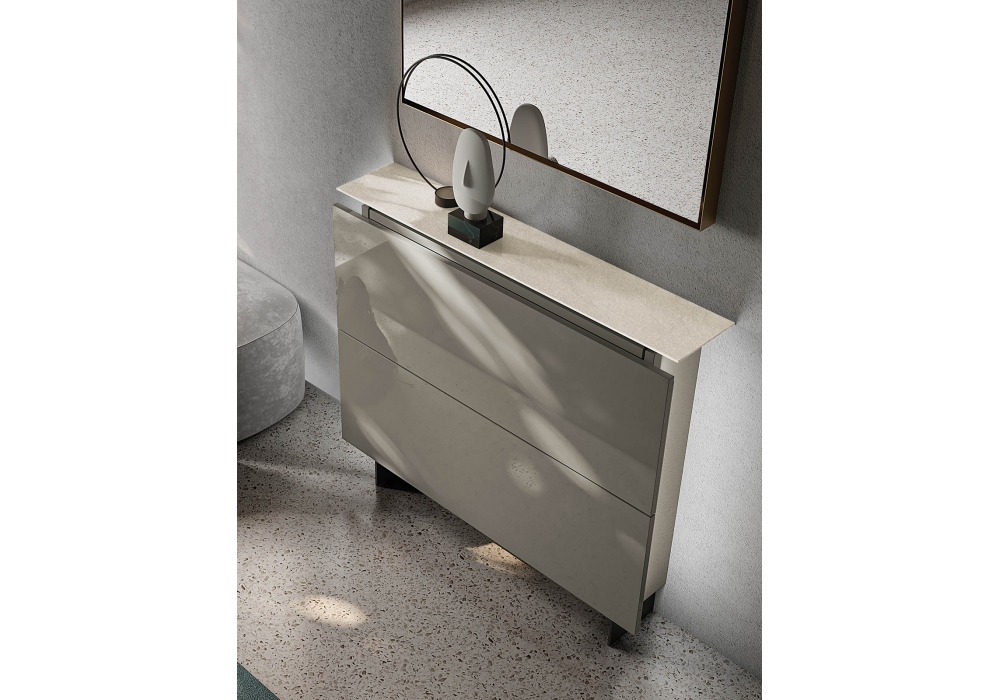 Hosoi von Birex entworfen, ist ein Schuhschrank mit einer Struktur aus zertifizierten Spanplatten, die mit Melamin beschichtet oder lackiert sind. Öffnen durch seitlichen Griff an der Tür. Internes Schuhregal aus Birkensperrholz und anthrazitfarbenen Kunststoffstützen und Metallbasis. Extraleichte transparente Glasplatte.