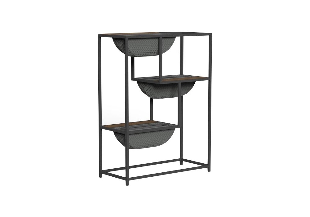 Jackie ist ein Blumenkasten aus der Jackie-Kollektion, das für Talenti entworfen wurde. Struktur in weiß oder graphit lackiertem Aluminium, mit Holzeinsätzen. Der Jackie Pflanzer, ausgestattet mit drei Behältern aus grauem Kunststoffseil, misst 90 x 40 cm und hat eine Höhe von 120 cm.