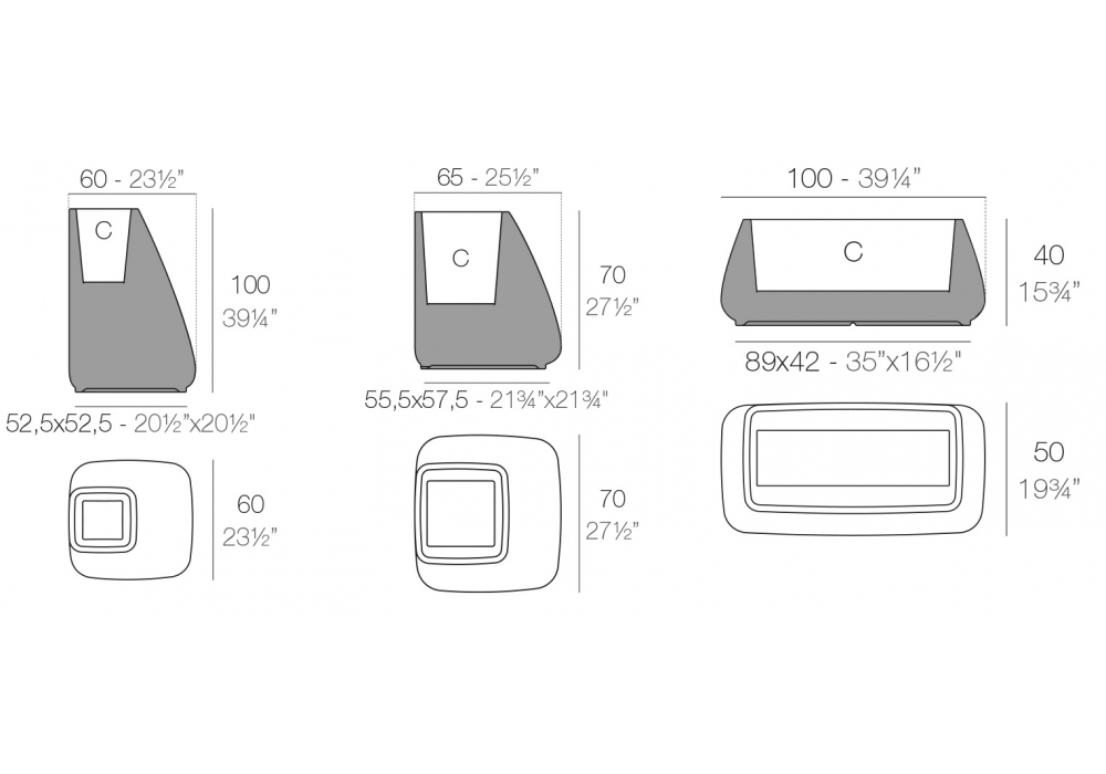 | Abmessungen | 100 x 40 x H 50 cm; 65 x 70 x H 70 cm; 60 x 60 x H 100 cm |