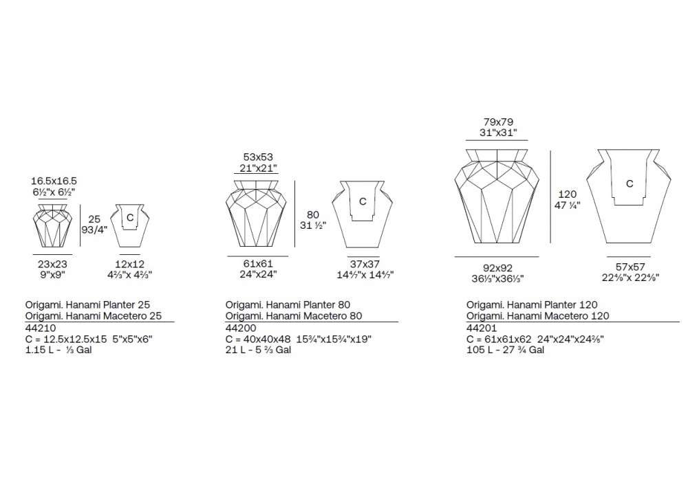 | Abmessungen | Ø 23 x H 25 cm; Ø 61 x H 80 cm; Ø 92 x H 120 cm. |