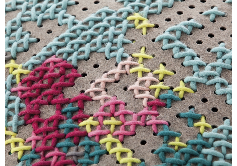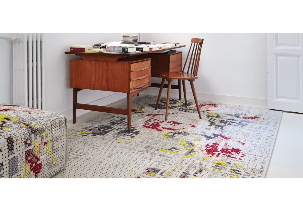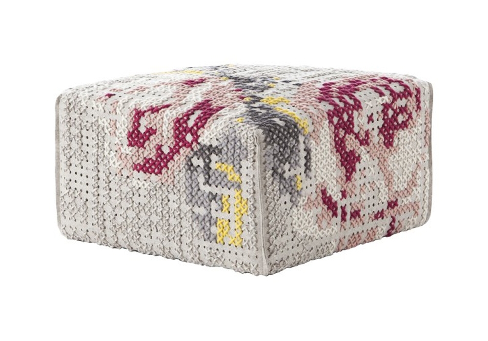 Canevas Flowers Square von Charlotte Lancelot für Gan entworfen, ist ein Sitzpouf mit Holzstruktur, Schaumstoffpolsterung und 100% Wollbezug. Verfügbarin zwei Ausführungen.