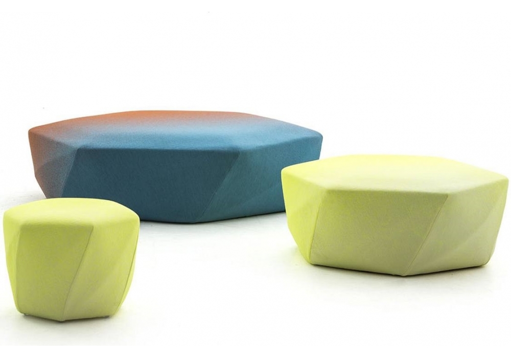 Brook von TokuJiin Yoshioka für Moroso entworfen, ist ein Hocker mit Innenstruktur aus Polymerverbundstoff und expandiertem Polyurethan mit Holzsockel. Transparente PVC-Einlegesohlen. Polsterung in verschiedenen Stoffen.