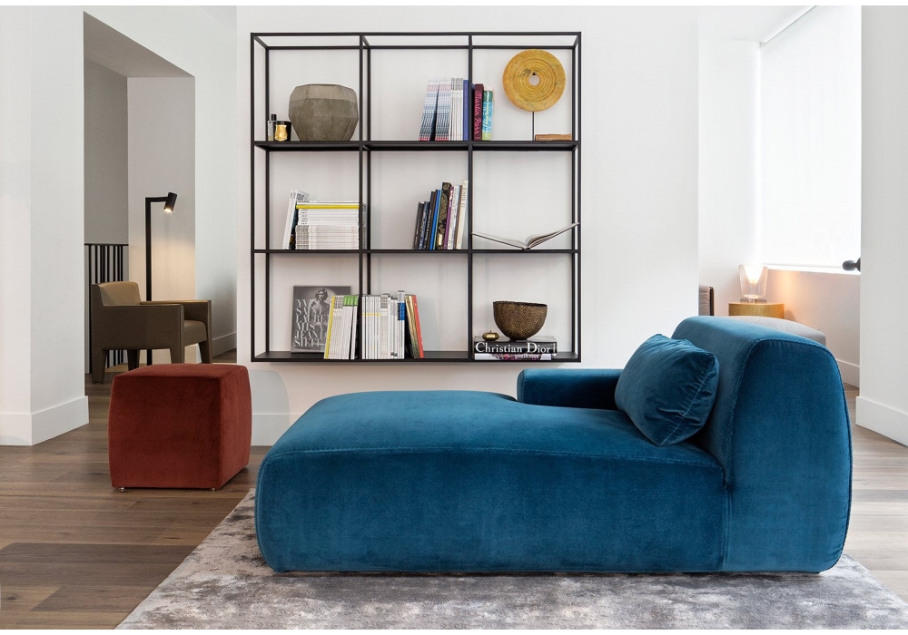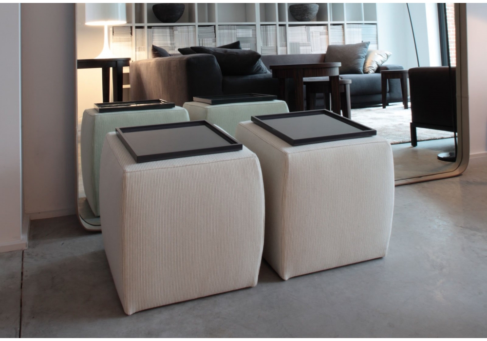 Charlot von Andrea Parisio für Meridiani ist eine Kollektion von Hockern mit festem Bezug. Holzgestell und Gleiter aus Metall.