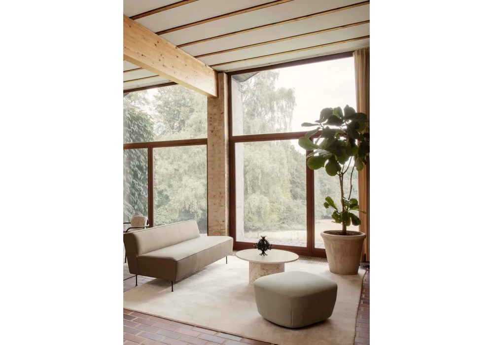 Stay, von Space Copenhagen für Gubi entworfen, ist ein Pouf mit Rahmen aus Massivholz mit Polyurethanschaum überzogen. Bezug verfügbar in einer Vielzahl von Stoffen und Ledern.