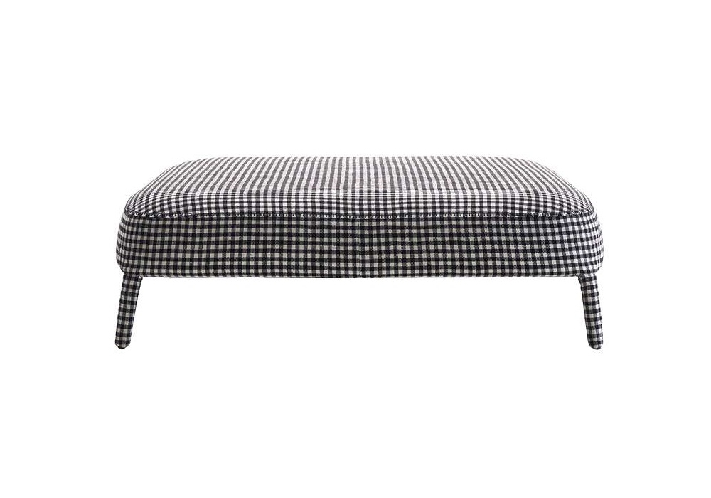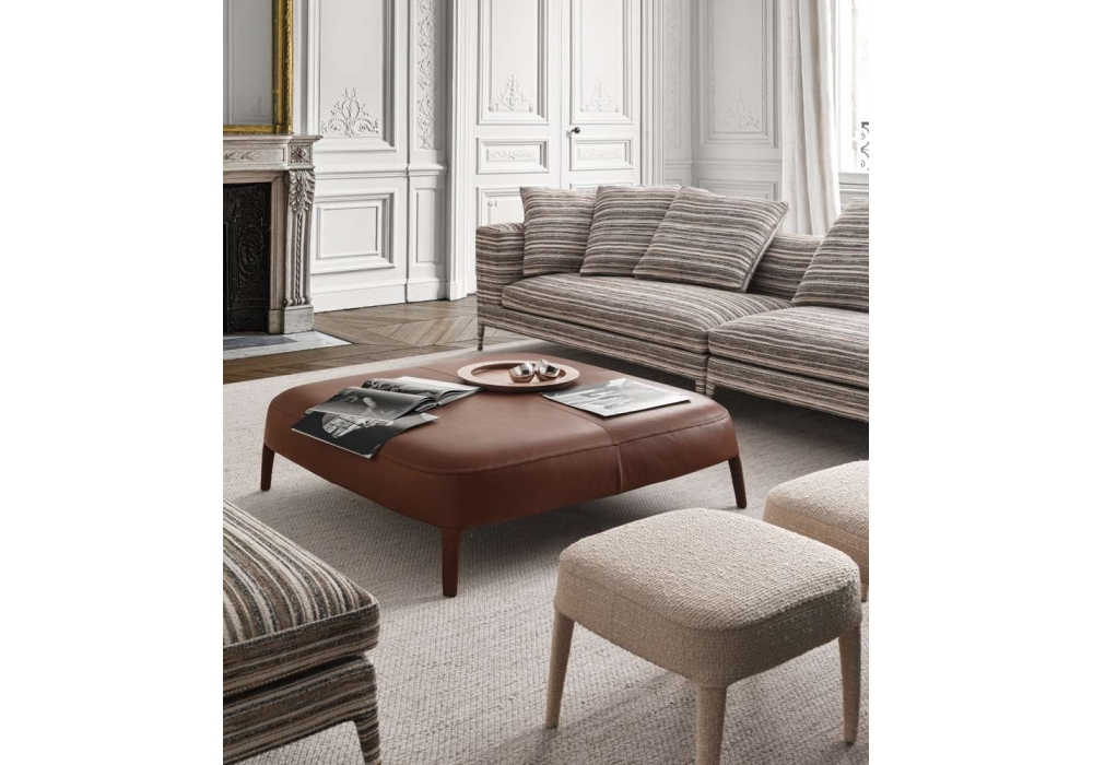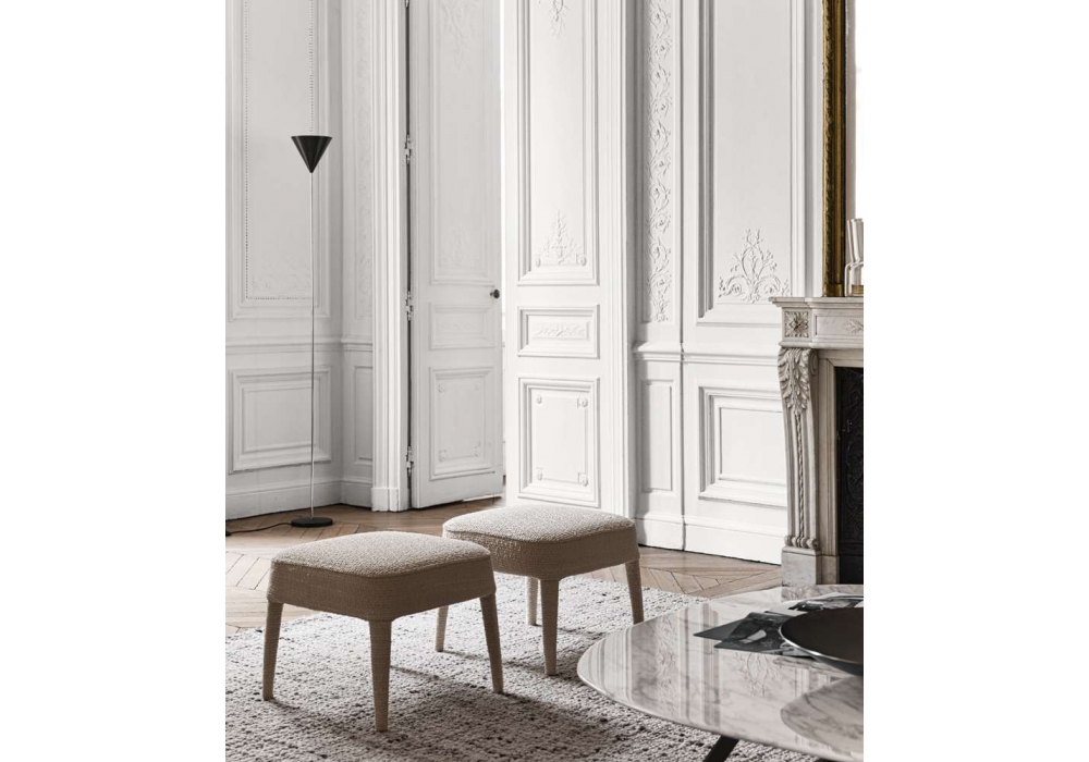 Febo von Antonio Citterio für B&B Italia entworfen ist ein Hocker mit gepolsterten Beinen. Verfügbar in drei Größen mit Stoff- oder Lederbezug. Für die Stoffversion sind die Nähte nur mit Steppstich erhältlich; für die Lederversion können die Nähte zwischen Steppstich oder Steppstich gewählt werden. Die Version mit Steppstich kann nur Ton-in-Ton ausgeführt werden.