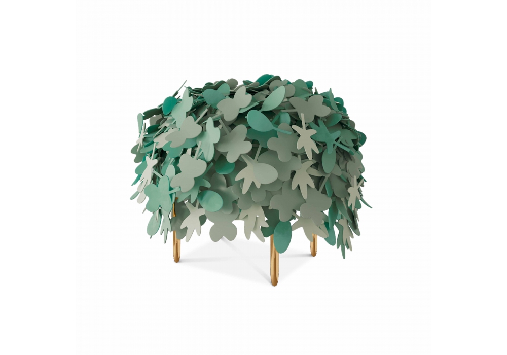 Leaf von Marcantonio für Scarlet Splendor entworfen, ist ein Sitzpuff mit Messingfüßen und einer Struktur aus Holz, Schaumstoff und Leder.