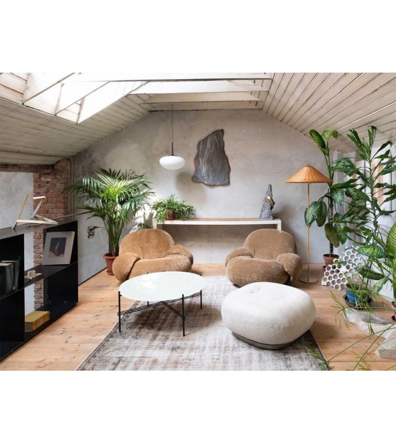 Pacha von Pierre Paulin für Gubi entworfen, ist ein Puff komplett gepolstert und mit Stoff oder Leder bezogen mit Holzgestell. Es ist in einer drehbaren oder festen Version erhältlich.