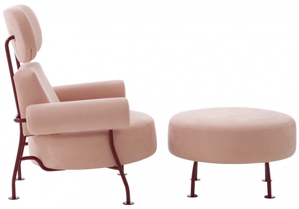 Astair von Pierre Charpin für Ligne Roset entworfen, ist ein Hocker mit Untergestell aus bordeaux oder schwarz lackiertem Stahlrohr. Sitzkissen mit Taschenfederung, hochelastischer Polyurethan-Bultex-Schaum. Bezug aus Stoff oder Leder.