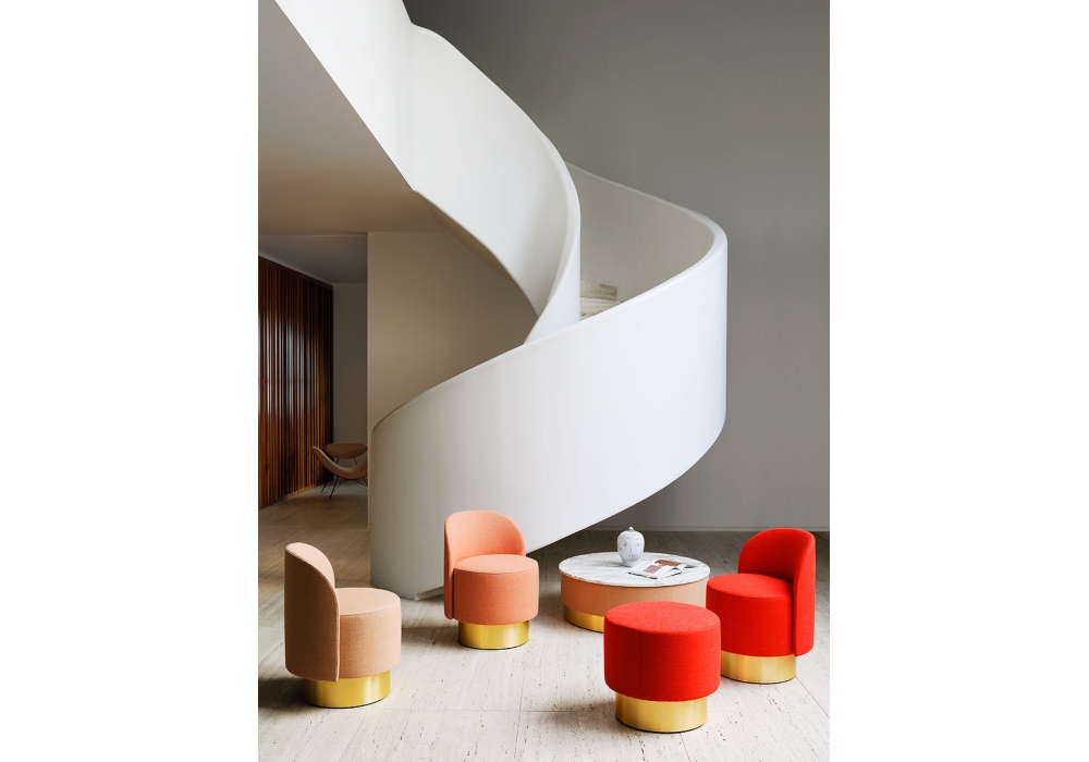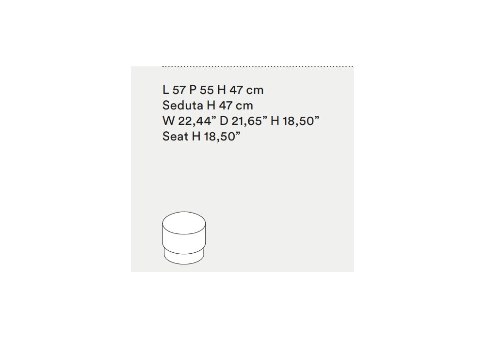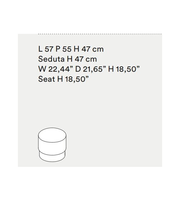 Pastilles von Studiopepe für Tacchini entworfen, ist ein Sitzpuff mit Innenstruktur aus Pappelsperrholz, mit Polsterung aus Polyurethanschaum in verschiedenen Dichten. Die Polsterung ist nicht abnehmbar und in verschiedenen Stoffen und Farben erhältlich. Die Basis ist aus Laminat, in drei Ausführungen.