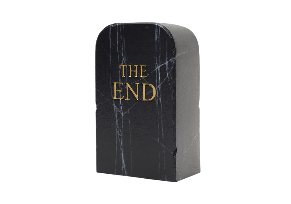 The End Black, von Toiletpaper für Gufram entworfen, ist ein mit Polyurethanschaum bezogener Pouf, der von Hand mit Guflac veredelt und dekoriert wurde. Der Effekt ist der eines gefälschten schwarzen Marmors, aus dem der Grabstein besteht, der ironischerweise durch den Hocker dargestellt wird.
